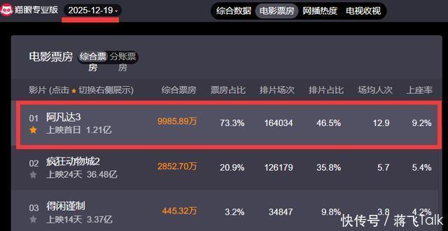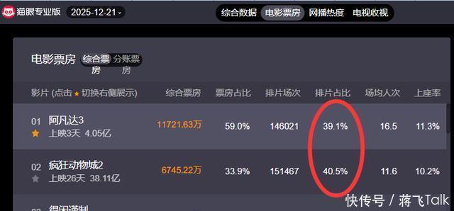 2025年真的是“动画电影之年”, 春节就出现了一部现象级动画电影 《哪吒2》 ,票房直接干到全球影史第五。后来又出来了国产 《浪浪山小妖怪》 、日本动画 《鬼灭之刃》等等 ,现在又来了一个国内票房达37亿的迪士尼动画 《疯狂动物城2》 ,而且上映快1个月了,热度依然不减,现在的排片占比超过上映才2天的《阿凡达3》,成功“截击”了《阿凡达3》的票房势头。